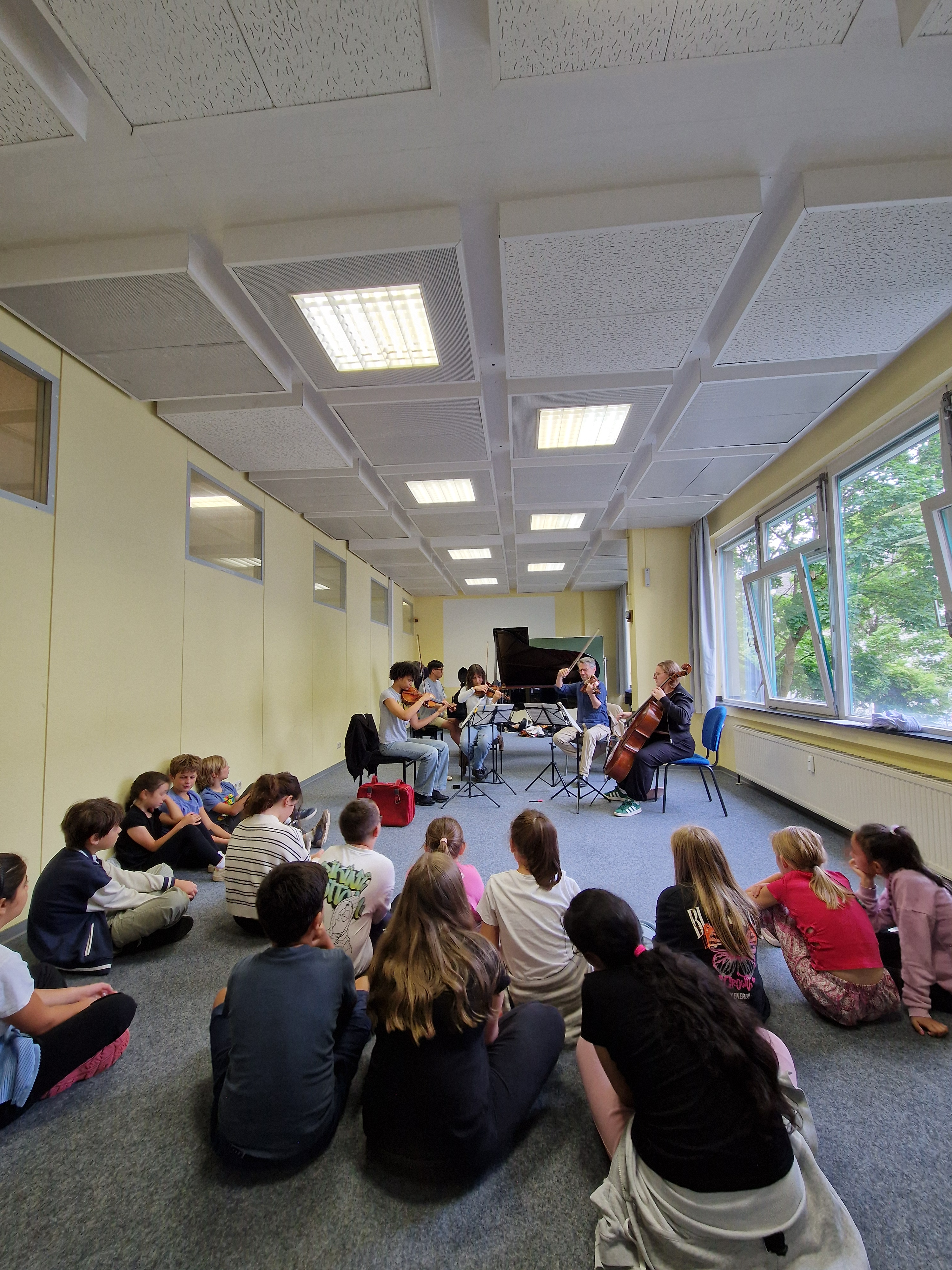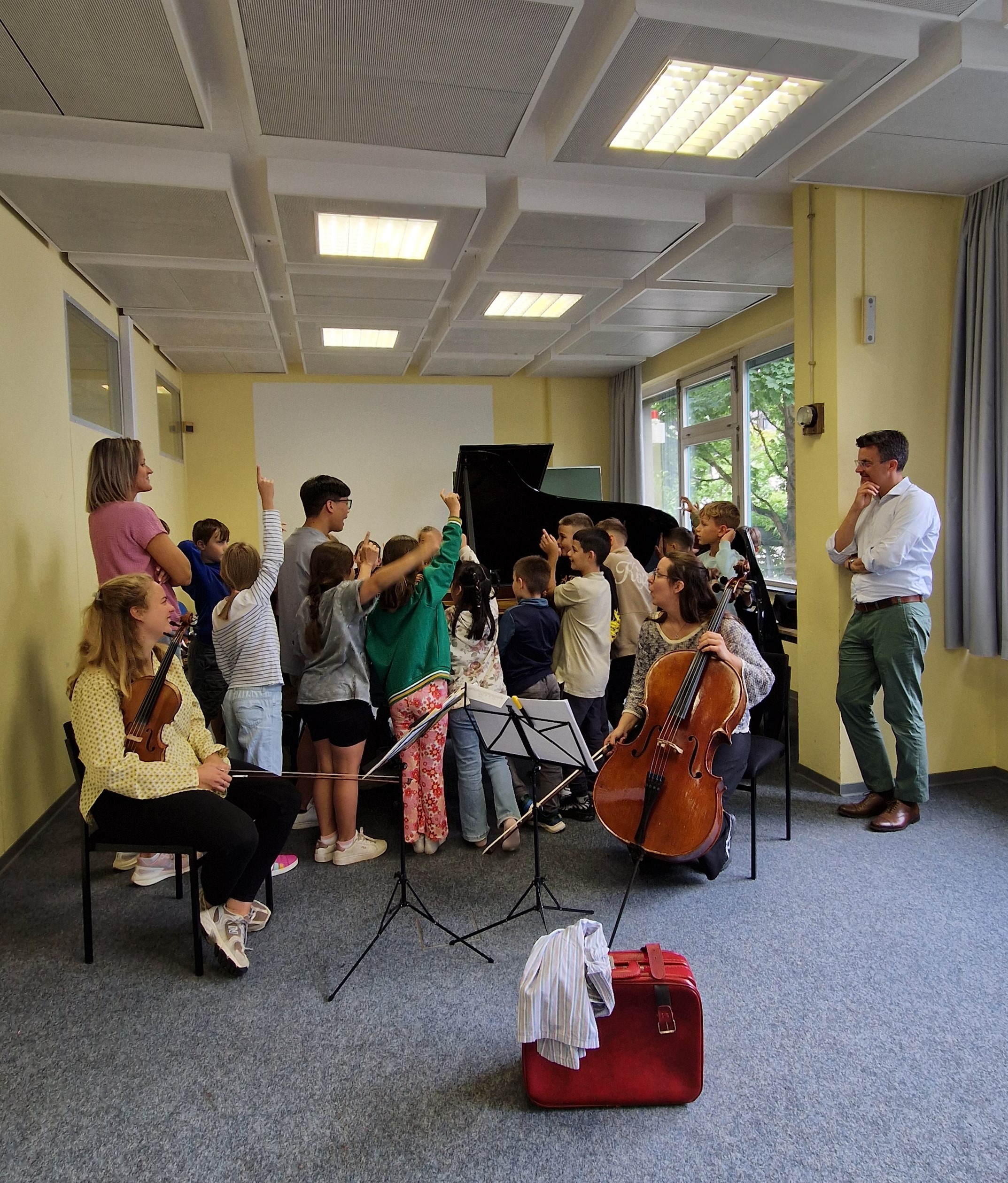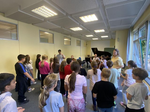 Am Dienstag, dem 02.09.25 wurden die Viertklässler unserer Schule im Rahmen des Konz Musik Festivals von Teilnehmern und Dozenten der damit verbundenen Meisterakademie mit „einem Koffer voller Klang“ mit auf Reisen genommen und in die Welt der klassischen Musik versetzt.